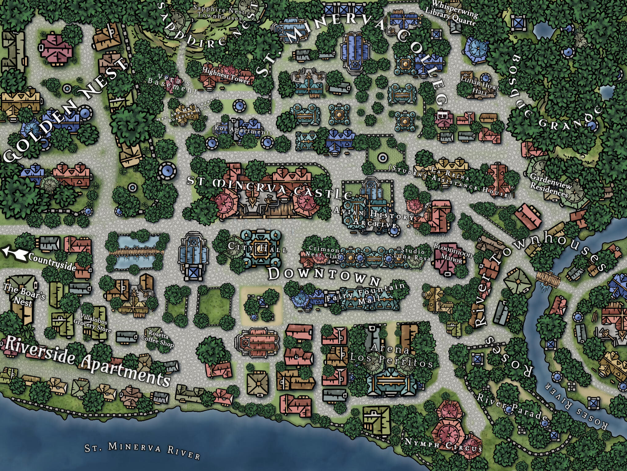 ◇ Roses River Townhouses: though still located in the charming district of Saint Minerva City, is a cozy and affordable community designed for those of middle income. The avenue has a warm, welcoming vibe, and while it may not have the opulence of high-end neighborhoods, it still carries a quiet charm. The townhouses here are slightly more compact, but well-built, with charming facades that showcase a variety of warm, earthy tones, like soft beige, sage green, and terracotta. Many of the homes are shared apartments, often with two or three smaller units within each townhouse, making them more affordable for those who seek a pleasant, yet practical, living space. Each unit is functional and cozy, with large windows allowing ample light to flood the rooms. The townhouses are neatly maintained, with flower boxes hanging from the windows and small private gardens at the front, where residents can grow herbs or colorful flowers. Located near Roses River, where River Parade events occur
