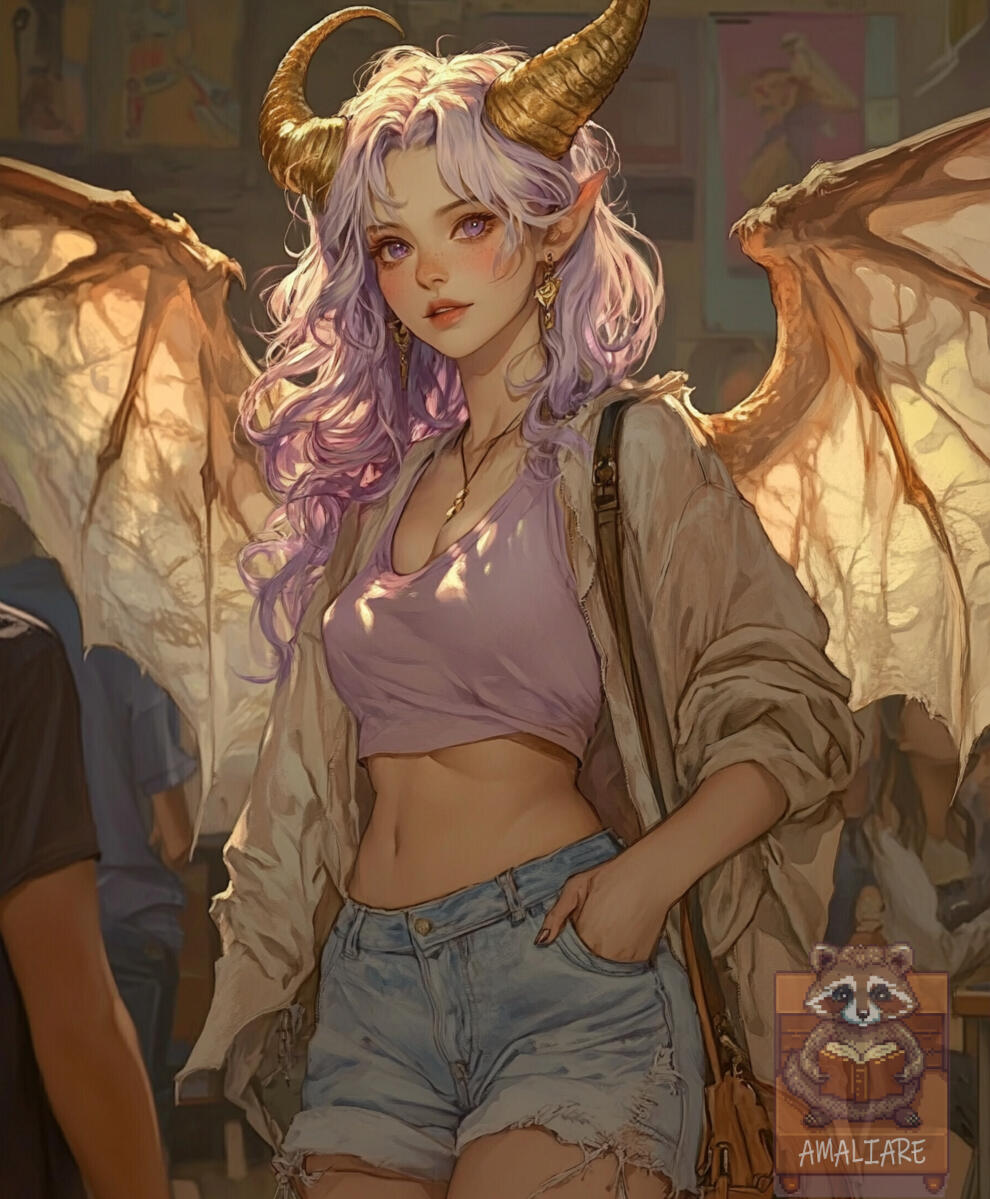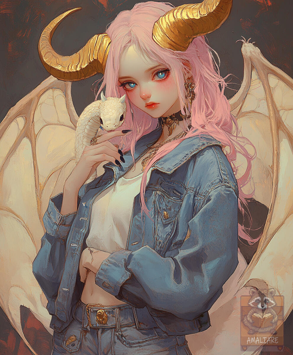 Veronika Arzan (chimeric demihuman): Pink hair, with Golden wings and horns, and a white snake attached to her coccyx called Krissy, 20 years old, singer, composer and co-founder of the band.