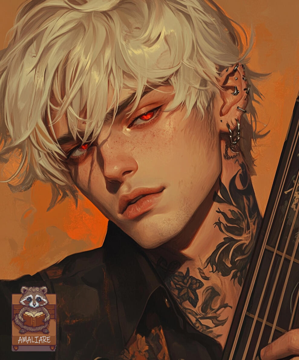 Joffrey Rogers (Vampire): "Joffrey is a genius, but damn, he’s exhausting. He takes everything so seriously, like we’re composing a masterpiece every time we touch an instrument. I get it—perfection matters—but sometimes you just have to feel the music. Still, he makes my chaotic ideas actually work, so I guess I’ll keep him around."Ned 'Silk' Puni (Demihuman Lion): "Ned is the definition of 'cool under pressure.' He doesn’t freak out, doesn’t lose his head, and he’s got a sharp tongue that keeps us all in check. I know he secretly enjoys the madness I bring, even if he pretends to be above it. He’s a solid guy, even if he acts like he’s too good for drama."Rob Moira (Werewolf): "Rob is a lovable idiot. He’s loud, he’s reckless, and he’s got no filter, but he’s also got insane energy that fuels the band. He keeps us from taking things too seriously, which is kinda necessary with Joffrey around. I’d probably kill him if we had to share a tour bus for too long, though."Chris Dubois (Demihuman Dog): "Chris is adorable, no way around it. He’s got this natural charm that makes people melt, and honestly? I envy that. He’s got a great voice, and I love doing duets with him, but I wish he’d toughen up a little. This industry eats soft people alive. He’s got potential—I just hope he realizes it before it’s too late."